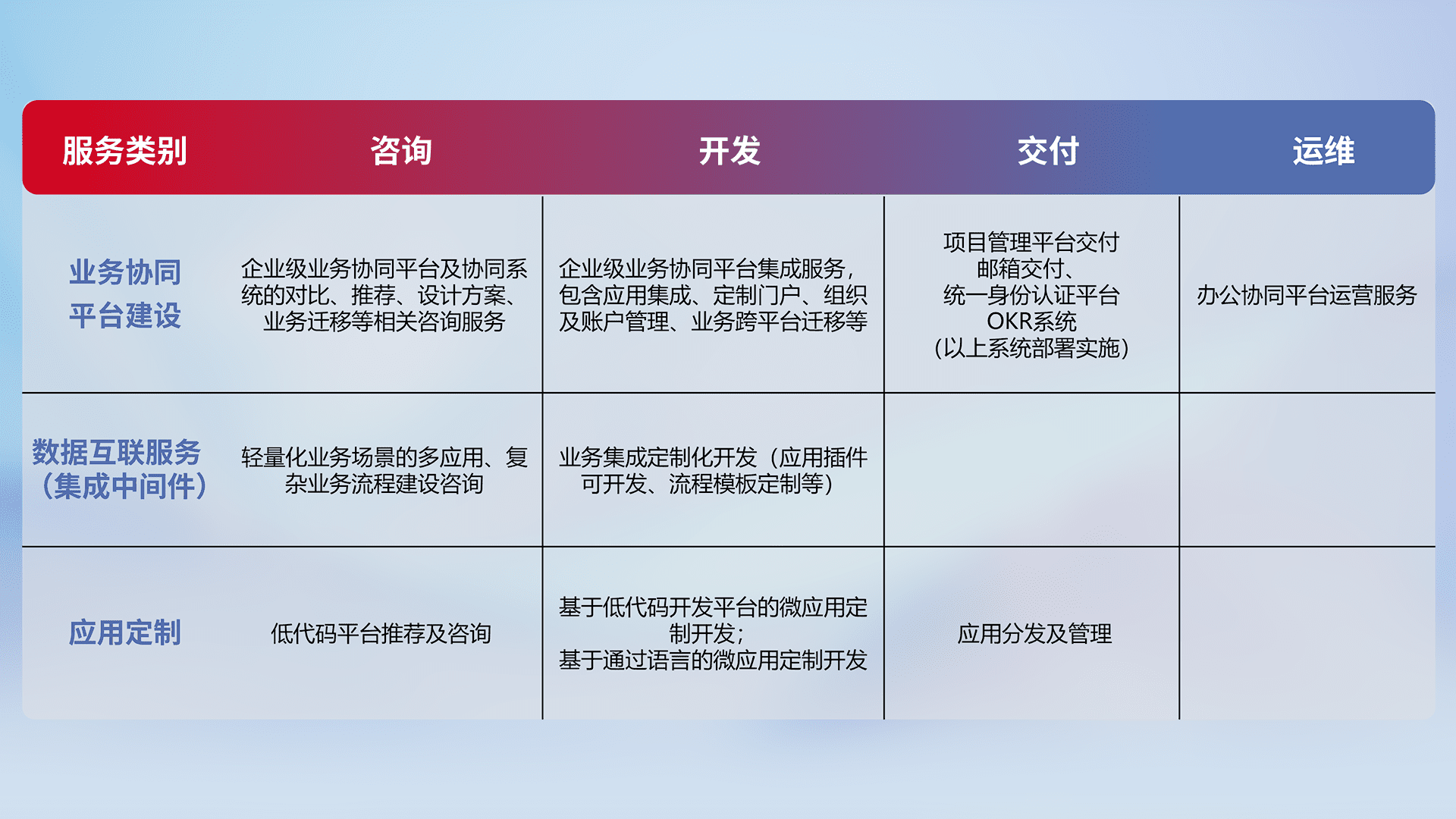 针对钉钉、、企微、、、IDaas等平台级产品提供产品的规划、、方案、、、交付、、、、定制化开发等服务,,实现如统一协同办公、、、智能客户服务、、、、混合会议管理、、智能数据查询、、、、等业务场景,,,,实现数字化转型。。