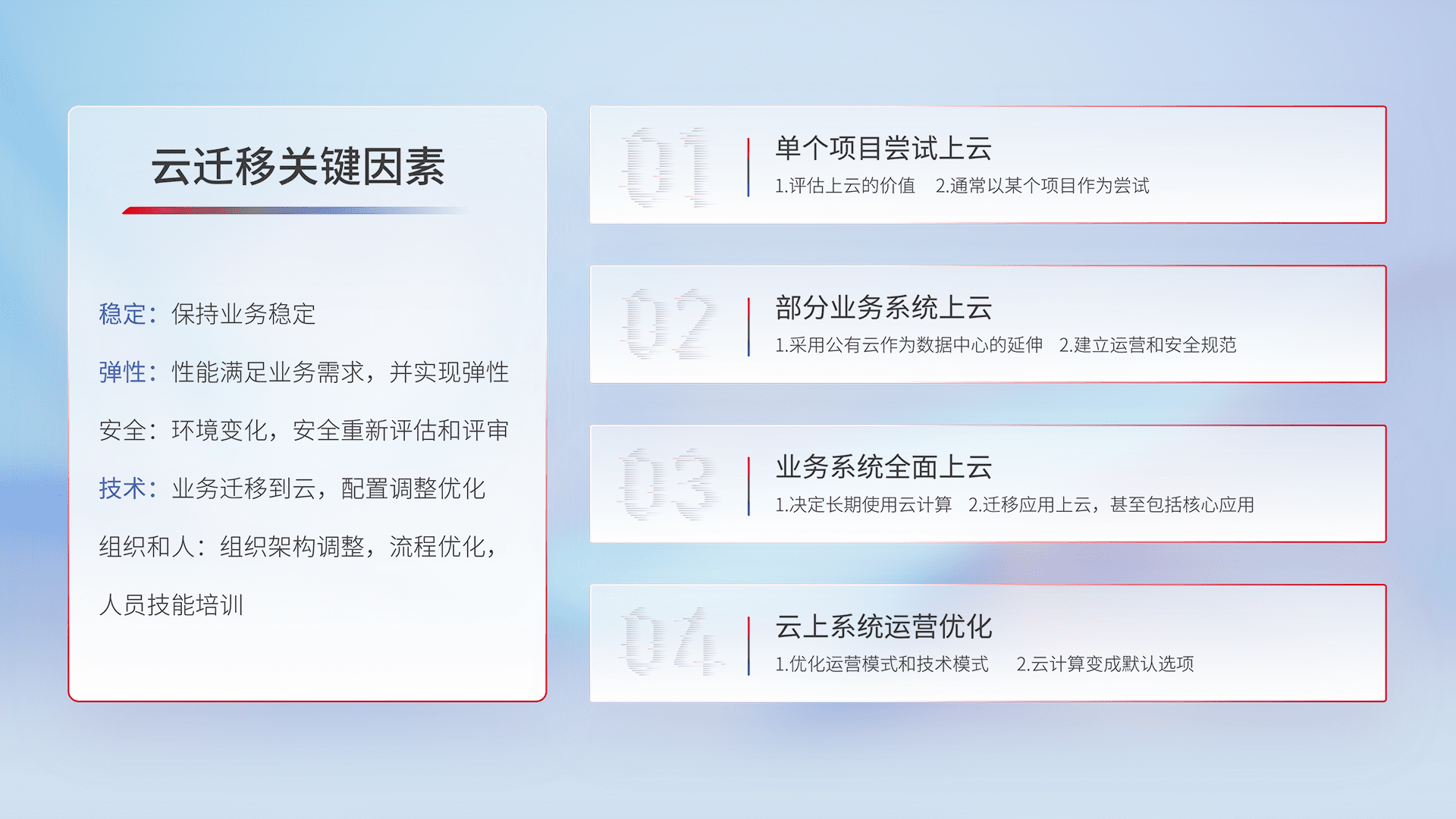 结合实际业务,,,,从规划设计、、、、云平台选型、、、云原生改造、、、、数据迁移、、、、集成交付,,迁移全过程为客户识别最佳上云路径,,,做好风险识别管理,,,,设计网络架构、、、、身份权限、、、安全审计合规、、、、操作审计、、、日志审计、、、、监控告警策略、、、多站点容灾设计等,,对云上基础设施进行整体规划,,提升IT治理水平,,以满足弹性、、高可用、、高性能的需求。。。。