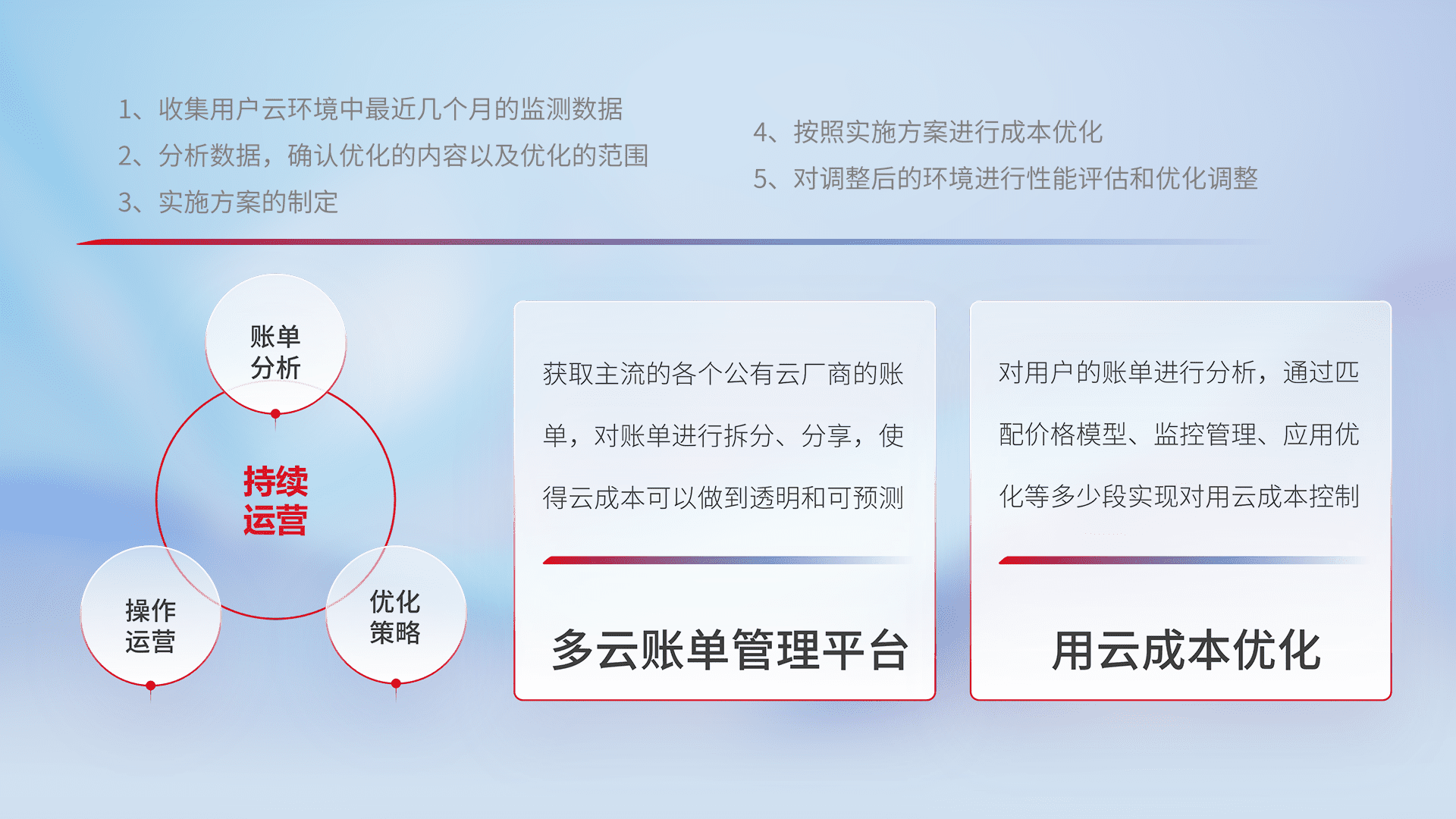 通过多云纳管,,,以统一的资源数据模型把客户的云资源进行抽象和封装,,,,进而实现对多云资源的统一操作,,,保障云资源管理的可靠性、、、、稳定性与可用性。。量身定制化运维内容,,配置、、开发运维、、、、补丁管理、、、、备份、、监控、、认证和访问管理、、、、审计和日常巡检等,,,保障在用云过程中的可靠度,,,稳定度以及高可用率。。。